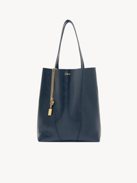Crafted from shiny grained calfskin, the Chloe Spin tote bag has a minimalist silhouette elevated with graphic lines. A dangling chain features the Maison's signature Chloe and Horse Medals. Wear on the shoulder or slide the handles through the ring for relaxed hand carry. PRODUCT DETAILS Chloe Spin tote bag in shiny grained calfskin Main material: Cowhide Main lining: Cowhide Carry: Shoulder & hand - 1 main compartment Comes with a dust bag - Width: 10.6" (27 cm) - Height: 11.8" (30 cm) - Depth: 5.5" (14 cm) - Handle drop: 9.1" (23 cm) This tote bag is made from semi-aniline leather. The half-transparent finish imparts a robust nature to the product while preserving its natural character. Follow all care instructions on the insert. This Chloe Spin bag is made with unlined leather, so there may be slight marks inside the bag, such as veins or scratches. Color: Tapestry Blue Item code: CHC25SS811N8444Q