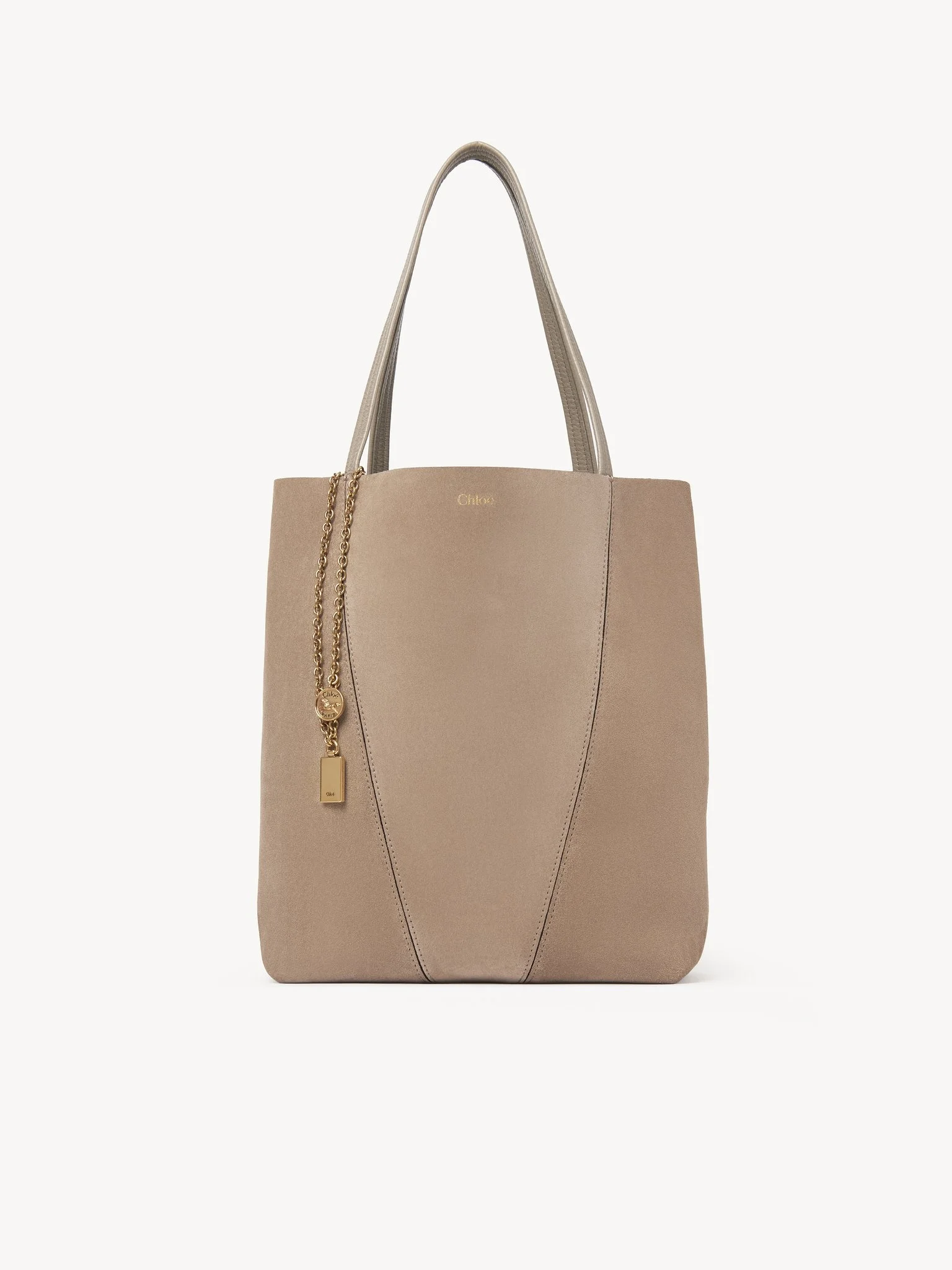 Crafted from suede calfskin, the Chloe Spin tote bag has a minimalist silhouette elevated with graphic lines. A dangling chain features the Maison's signature Chloe and Horse Medals. Wear on the shoulder or slide the handles through the ring for hand carry. PRODUCT DETAILS Chloe Spin tote bag in suede calfskin Main material: Calfskin Main lining: Calfskin Trim: Cowhide Carry: Hand & shoulder - 1 main compartment Comes with a dust bag - Width: 10.6" (27 cm) - Height: 11.8" (30 cm) - Depth: 5.5" (14 cm) - Handle drop: 9.1" (23 cm) To make this product, Chloe worked with Leather Working Group (LWG) certified leather manufacturers. LWG certifies tanneries based on their water and energy usage, management of chemicals, solid waste, and wastewater. Color: Motty Grey Item code: CH25AS811P9923W