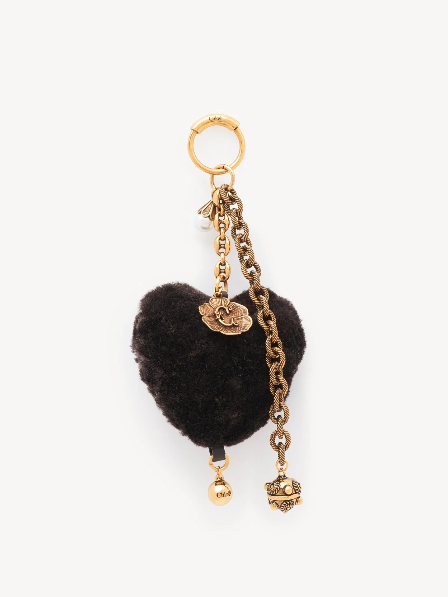DESCRIPTION This Chloe Symbols Heart Shearling bag charm features two gold brass chains in different textures, embellished with dangling pendants. A Chloe logo engraving and the Chloe "C" sign this charm. PRODUCT DETAILS Chloe Symbols Heart Shearling bag charm in shearling & brass Main material: Shearling Secondary material: 95% Brass, 5% Steel Trim: Calfskin - One size only - Chloe logo engraving - Personalize your bag with this charm - Width: 3.1" (8 cm) - Height: 7.1" (18 cm) - Depth: 1.2" (3 cm) Color: Kohl Brown Item code: CH25WK169Q4924X CARE INSTRUCTIONS To ensure this item's quality and longevity, wear it regularly and avoid exposure to direct sunlight and heat. Avoid impact and contact with water, perfume or chlorine. Store in your pouch and box when not in use.
