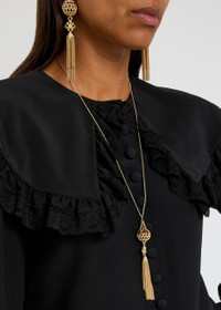 Info & Care Chloe brass necklace Obsidian pendant in openwork casing, chain tassel, textured details,;designer tag Adjustable;lobster-clasp;fastening Presented in a designer-stamped box with a pouch Coordinating items available; Size & Fit Length: 73cm