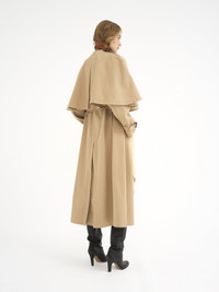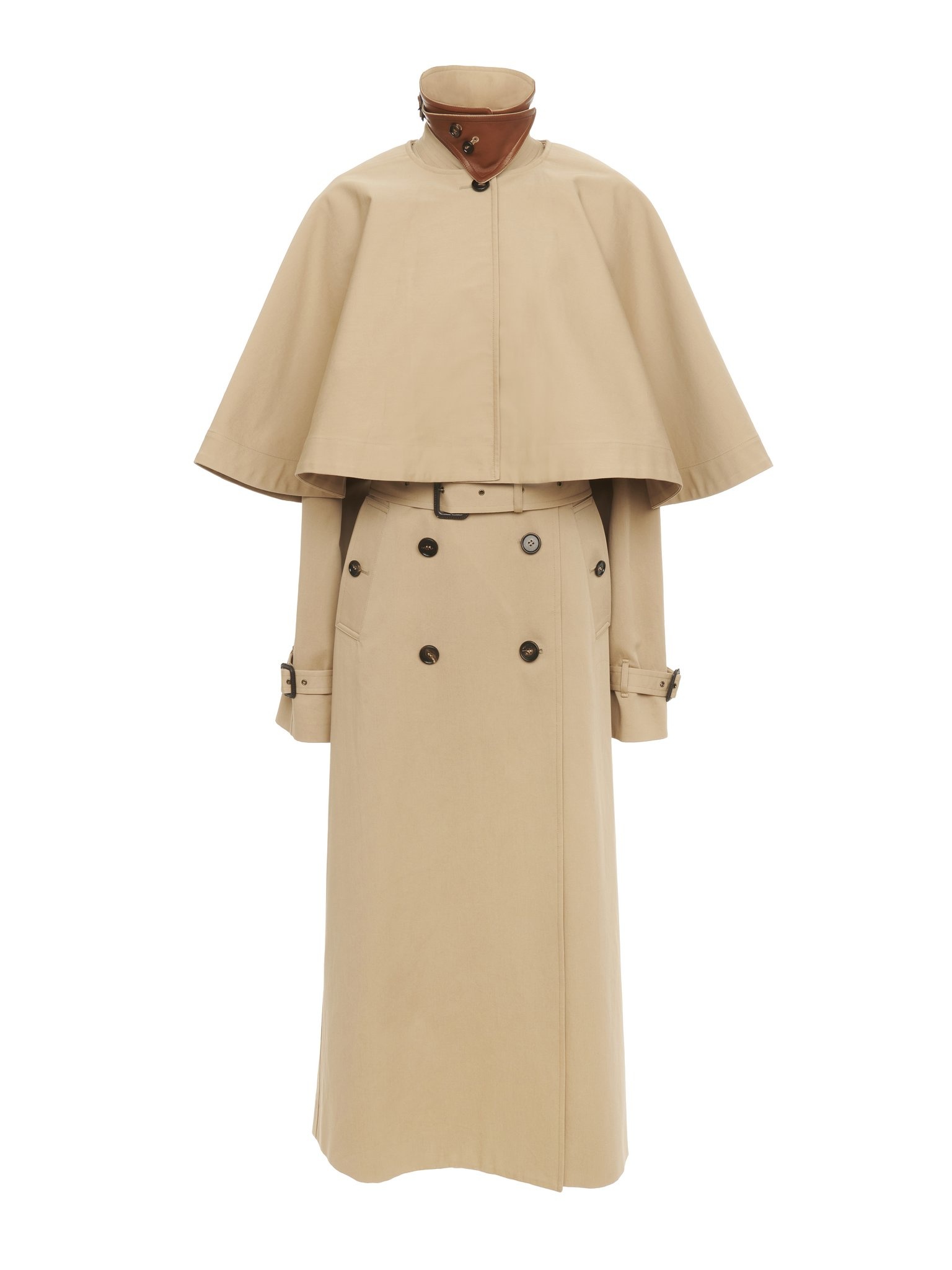 Classic water-repellent trench coat in organic soft cotton gabardine featuring a removable cape, cuff tabs, leather details at the collar and a throat latch. PRODUCT DETAILS Classic trench coat outer shell: 100% Cotton Under collar: 100% Lambskin Lining: 62% Viscose, 38% Cotton Buckle: 50% Calfskin, 50% Zamak Buttons: 100% Water buffalo horn Care: dry cleaning only Fit: long, tailored - The model is 5'10" (178 cm) and wears a prototype in size 34 - Cape trench coat - Horn buttons - Self-fabric belt - Removable cape - Side pockets - Hook fastening at neck - Buckled chin strap - Back vent An organic cotton farming system sustains the health of soils, ecosystems and people by eliminating the use of toxic and persistent organic pollutants and increasing water conservation. Color: Worn Brown Item code: CHC24AMA2304426A