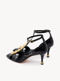 DESCRIPTION Crafted from patent calfskin, these Cleia heeled sandals feature a cut-out, T-strap silhouette embellished with gold-tone cabochon studs. Chloe-engraved gold-tone hardware signs the heel and adjustable ankle strap. PRODUCT DETAILS Sandal heel height: 2.8" (7 cm) Heel-to-toe drop: 2.6" (6.5 cm) Upper: calfskin Inner sole: lambskin Main lining: lambskin Sole: cowhide Heel: cowhide Fit true to size, European sizing - Buckle fastening To make this product, Chloe worked with Leather Working Group (LWG) certified leather manufacturers. LWG certifies tanneries based on their water and energy usage, management of chemicals, solid waste, and wastewater. Color: Black Item code: CH26S16QWC001