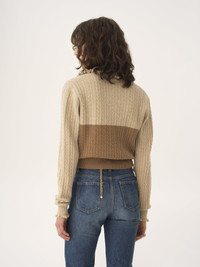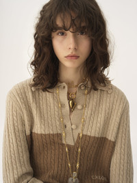 Bicolor collar sweater in a lower-impact wool and cashmere knit, featuring ruffle trims, fabric-covered buttons and Chloe logo embroidery. PRODUCT DETAILS Collar sweater outer shell: 70% Wool, 30% Cashmere wool Fit: straight - The model is 5'10" (178 cm) and wears a prototype in size S - Cable-knit sweater - Fabric-covered buttons at front The wool used in this product comes from a farm that respects animal welfare, maintains soil health, protects biodiversity and promotes native species. Color: Barley Brown Item code: CH25WMP1957020L