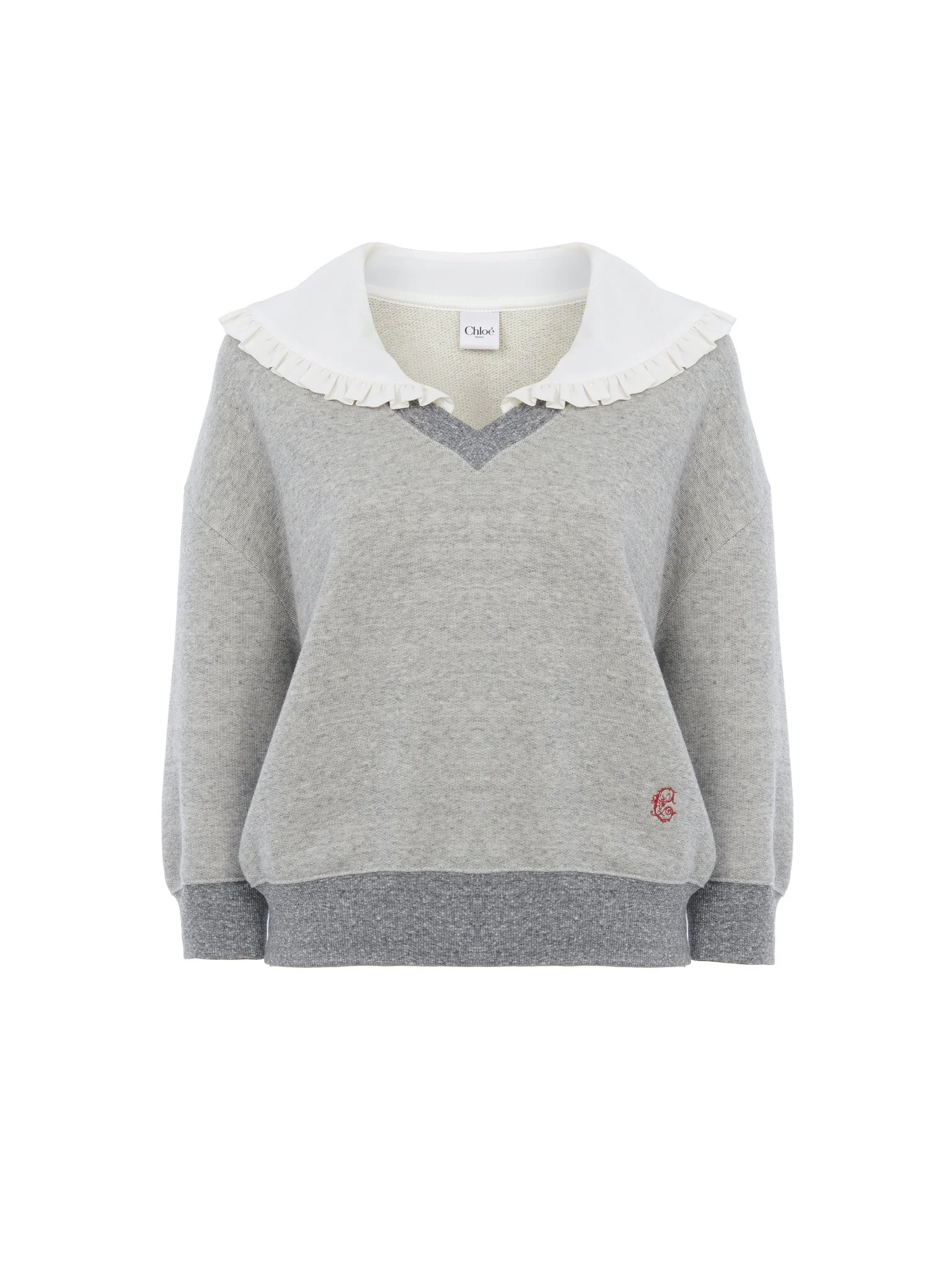 V-neck sweater in chine fleece with a ruffled silk collar and three-quarter sleeves, featuring baroque "C" embroidery at the hip. PRODUCT DETAILS Collar sweater outer shell: 85% Cotton, 15% Lyocell Collar: 100% Silk Fit: straight - The model is 5'10" (178 cm) and wears a prototype in size S - Cotton sweater - Slips on Color: Vapor Grey Item code: CH25WJH17194060