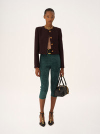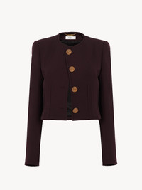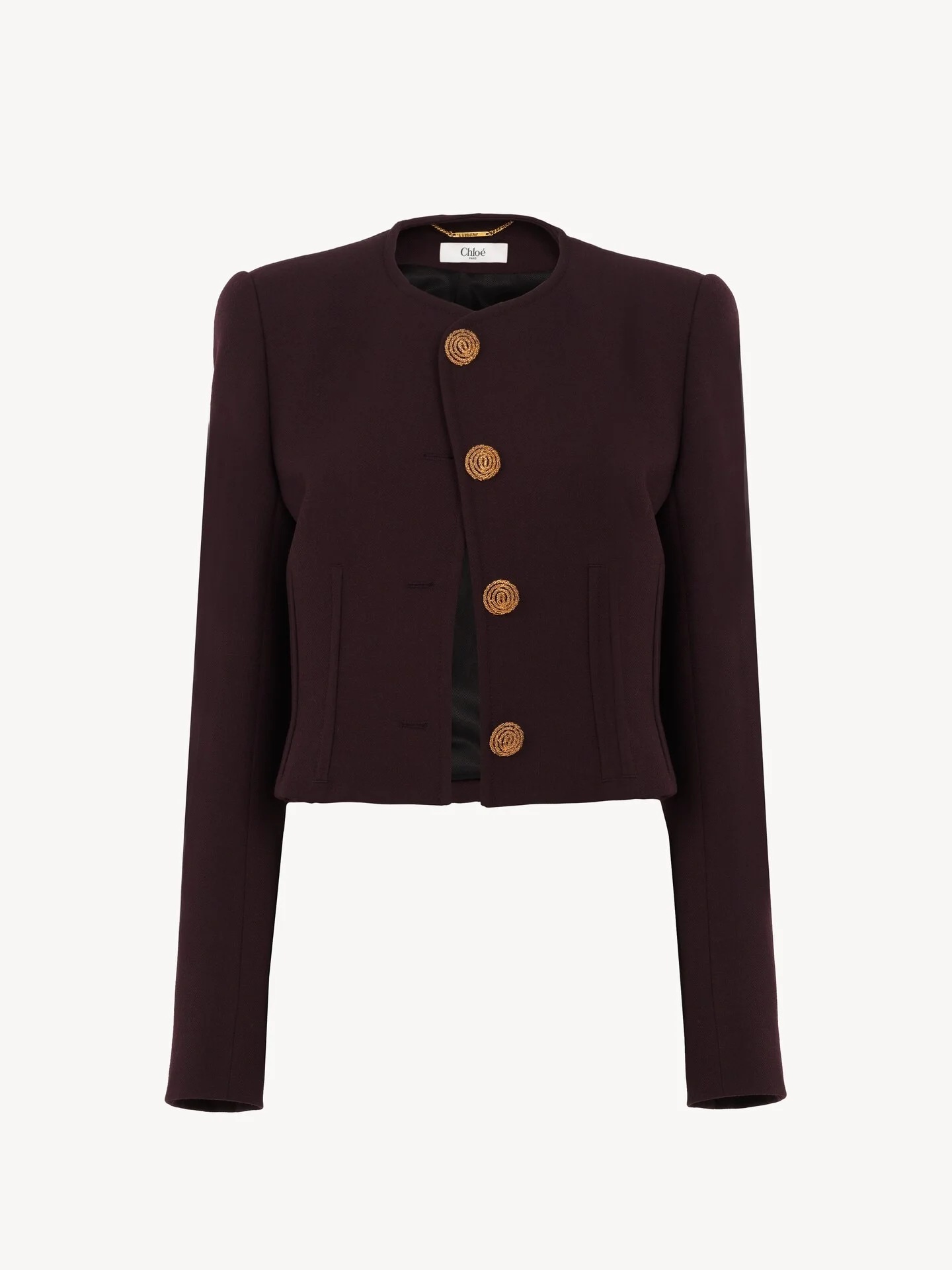 DESCRIPTION Single-breasted collarless cropped jacket in lower-impact wool crepe, featuring gold-tone jewelry buttons. PRODUCT DETAILS Cropped jacket outer shell: 100% Wool Lining: 51% Viscose, 49% Cotton Fit: cropped - The model is 5'10" (178 cm) and wears a prototype in size 36 - Chloe wool jacket - Jewelry buttons through front The wool used in this product comes from a farm that respects animal welfare, maintains soil health, protects biodiversity and promotes native species. Color: Obscure Purple Item code: CH26SVE0106156A CARE INSTRUCTIONS To preserve the integrity of your garment, please refrain from washing, entrusting its care to professional cleaning services for optimal maintenance. This garment cannot withstand any bleaching agent. To maintain its shape, gently iron this garment at a maximum sole plate temperature of 110°C, taking care to avoid any harsh pressure while ironing. Entrust this garment to a specialist for mild cleaning with tetrachloroethylene and solvent F, ensuring its delicate nature is maintained with the most care. To best preserve its form and texture, please do not tumble dry this garment. To maintain its delicate nature, do not wet clean this garment. TRACEABILITY Better traceability is central to improving our materials as well as social and environmental practices. Dyeing: Italy Finishing: Italy Weaving: Italy