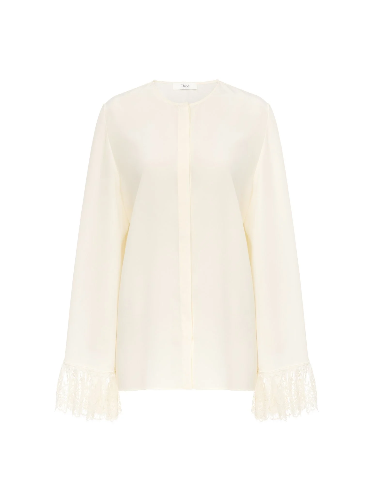Collarless fluid blouse in organic crepe de chine, featuring delicate lace trims at the flared cuffs. PRODUCT DETAILS Fluid blouse outer shell: 100% Silk Cuff braid: 66% Cotton, 34% Viscose Buttons: 100% Mother-of-pearl Fit: fluid - The model is 5’10” (178 cm) and wears a prototype in size 36 - Collarless silk blouse - Mother-of-pearl buttons through front Care: dry cleaning only Organic silk manufacturing restricts the use of pesticides, insecticides or harsh chemicals and incorporates methods that respect biodiversity, improve soil quality and reduce water consumption. Color: Coconut Milk Item code: CH24WHT77125103