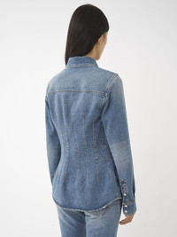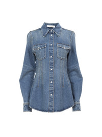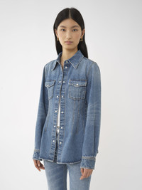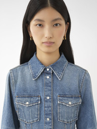 This Western shirt is cut from a "vintage" wash recycled cotton and hemp blend made exclusively for Chloé and laser-treated for reduced water use. Corsetry-inspired darts at the sides cinch the waist, lending a feminine touch to the classic city silhouette. Wear this shirt with the matching jeans for the full look. PRODUCT DETAILS Western shirt main material: 87% Cotton, 13% Hemp Care: gentle wash 85°F (30°C) Fit: classic - The model is 5’10” (178 cm) and wears a prototype in size 35 - Denim shirt - Snaps through front & at pockets - Chest pockets This denim is a blend of recycled cotton and natural fibers (hemp or linen), both considered lower-impact materials. Recycled cotton keeps its natural softness and inherent quality, with a reduced environmental impact. Using recycled cotton enables us to extend the lifespan of a fiber that has already been produced. Linen, hemp and ramie cultivations emit less greenhouse gases and require less water compared to other conventional natural fibers, which is why they are considered lower-impact materials by their nature. Color: Foggy Blue Item code: CHC24SDH01159470