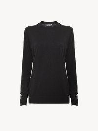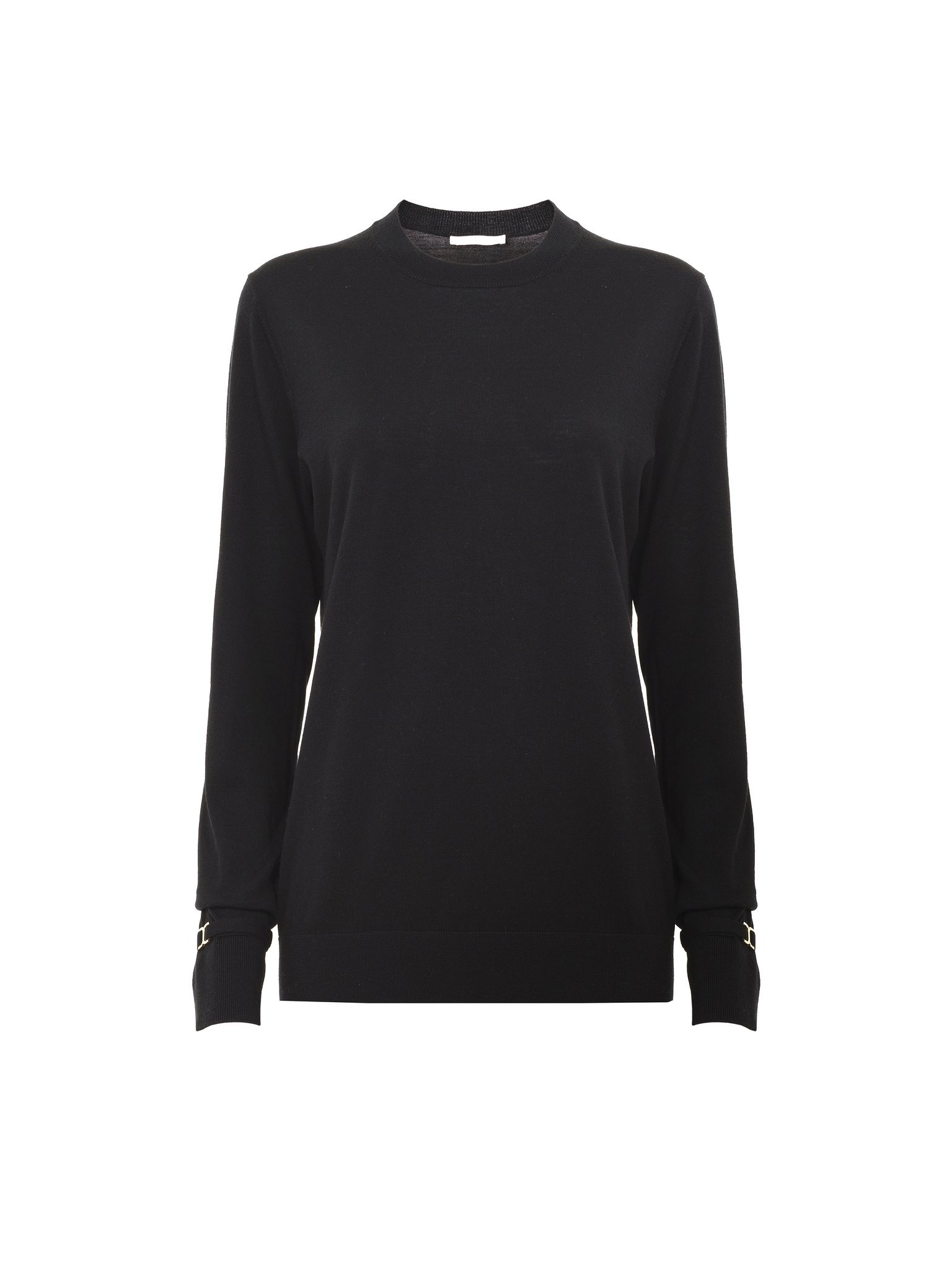 Made from a lower-impact superfine wool knit, this fitted sweater has a crew neck and ribbed trims for a relaxed mood. A hand-applied Marcie buckle details each cuff, lending a subtle jewelry finish to the timeless silhouette. PRODUCT DETAILS Fitted sweater main material: 100% Wool Care: dry cleaning only Fit: straight - The model is 5'10" (178 cm) and wears a prototype in size S - Crew-neck sweater - Slips on - Marcie buckle The wool used in this product comes from a farm that respects animal welfare, maintains soil health, protects biodiversity and promotes native species. Color: Black Item code: CHC24SMP11661001