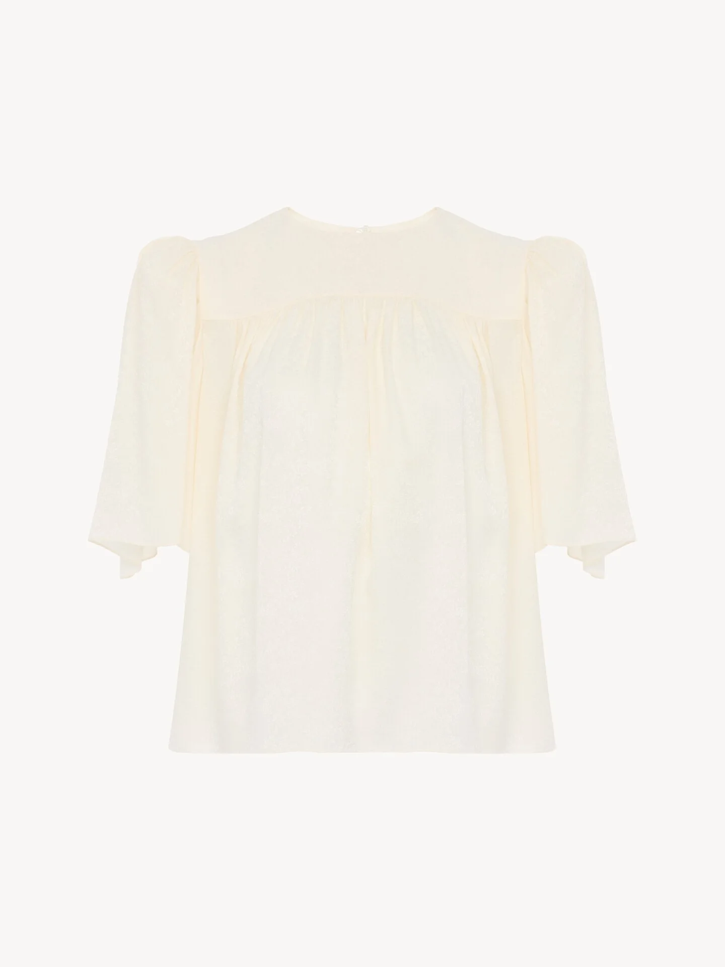 DESCRIPTION Crew-neck gathered top in organic silk jacquard with an ornamental motif. The fluid silhouette features draped sleeves and mother-of-pearl buttons at the back. PRODUCT DETAILS Gathered top outer shell: 100% Silk Buttons: 100% Mother-of-pearl Fit: fluid - The model is 5'10" (178 cm) and wears a prototype in size 36 - Short-sleeve silk top - Mother-of-pearl buttons at the back Organic silk manufacturing restricts the use of pesticides, insecticides or harsh chemicals and incorporates methods that respect biodiversity, improve soil quality and reduce water consumption. Color: Coconut Milk Item code: CH26UHT55332103 CARE INSTRUCTIONS To preserve the integrity of your garment, please refrain from washing, entrusting its care to professional cleaning services for optimal maintenance. This garment cannot withstand any bleaching agent. To maintain its shape, gently iron this garment at a maximum sole plate temperature of 110°C, taking care to avoid any harsh pressure while ironing. Entrust this garment to a specialist for mild cleaning with tetrachloroethylene and solvent F, ensuring its delicate nature is maintained with the most care. To best preserve its form and texture, please do not tumble dry this garment. To maintain its delicate nature, do not wet clean this garment. TRACEABILITY Better traceability is central to improving our materials as well as social and environmental practices. Dyeing: Italy Finishing: Italy Weaving: Italy