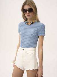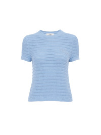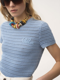 Fitted crew-neck top in organic cotton crochet knit with Chloe logo embroidery at the chest. PRODUCT DETAILS Crew-neck top outer shell: 100% Cotton Fit: fitted - The model is 5'10" (178 cm) and wears a prototype in size S - Short-sleeve Chloe top - Slips on An organic cotton farming system sustains the health of soils, ecosystems and people by eliminating the use of toxic and persistent organic pollutants and increasing water conservation. Color: Softy Blue Item code: CH25AMP0155540T