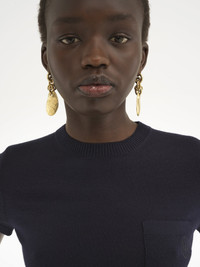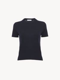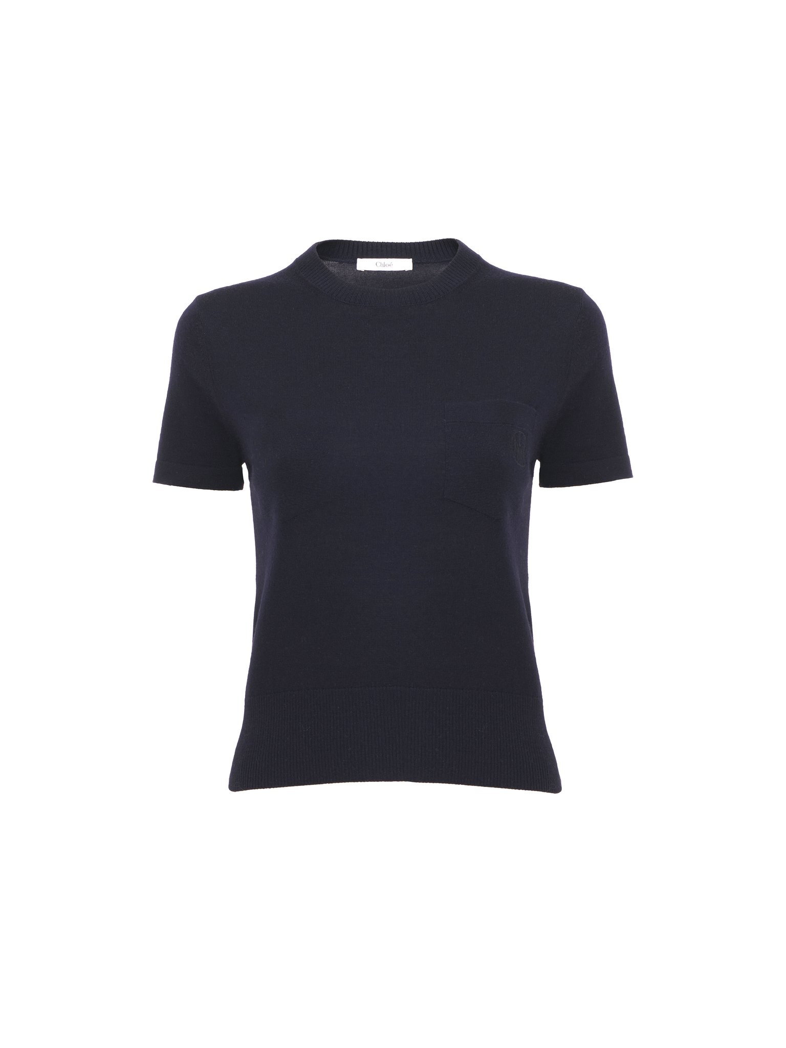 Slim-fit crew-neck T-shirt in lower-impact superfine wool knit with a single chest pocket detailed with tonal Chloé logo embroidery. PRODUCT DETAILS Crew-neck T-shirt outer shell: 100% Wool Front embroidery: 100% Polyester Collar and bottom hem rib part: 88% Wool, 8% Polyamide, 4% Elastane Care: gentle wash 85°F (30°C) Fit: fitted - The model is 5'10" (178 cm) and wears a prototype in size XXS - Knitted T-shirt - Chest pocket - Slips on The wool used in this product comes from a farm that respects animal welfare, maintains soil health, protects biodiversity and promotes native species. Color: Classic Navy Item code: CHC24AMP056604C6