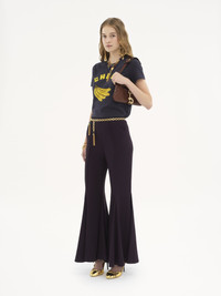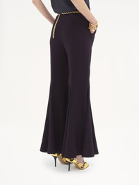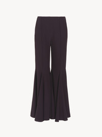 Cropped bootcut pants in washed crepe satin, featuring raised seams and a generous, fluid flared leg. PRODUCT DETAILS Bootcut pants outer shell: 75% Acetate fiber, 20% Silk, 5% Polyamide Inner: 76% Acetate fiber, 24% Silk Fit: cropped, bootcut - The model is 5'10" (178 cm) and wears a prototype in size 36 - Flared satin pants - Side zipper - Side pockets Care: dry cleaning only Color: Deep Purple Item code: CH25SPA0935556B