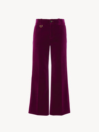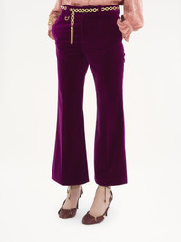 Vibrant cropped bootcut pants in soft cotton velvet, featuring a gold-toned D-ring at the right hip. PRODUCT DETAILS Cropped bootcut pants outer shell: 100% Cotton Inner: 51% Viscose, 49% Cotton Button: 100% Horn Fit: cropped, bootcut - The model is 5'10" (178 cm) and wears a prototype in size 36 - Colored velvet pants - Front zipper - Engraved button - Side pockets - Belt loops - Gold-toned D-ring at right hip Care: dry cleaning only Color: Pansy Purple Item code: CH25SPA3101752C