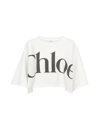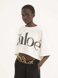 Cropped boxy T-shirt in cotton jersey with a faded Chloé logo print. PRODUCT DETAILS Cropped T-shirt main material: 100% Cotton Care: gentle wash 85°F (30°C) Fit: oversized, cropped - The model is 5'10" (178 cm) and wears a prototype in size S - Slips on Color: White Item code: CH24AJH09183101