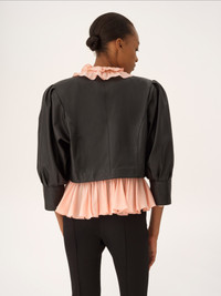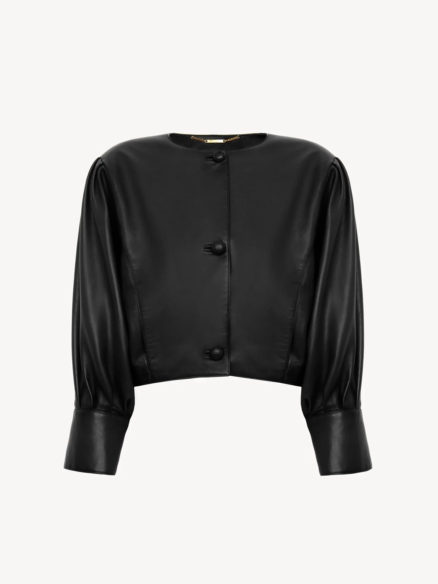 DESCRIPTION Cropped collarless jacket in plonge nappa leather, featuring three-quarter puff sleeves and leather-covered buttons. PRODUCT DETAILS Collarless jacket outer shell: 100% Lambskin Main lining: 100% Cupro Inside buttons: 100% Water buffalo horn Fit: cropped - The model is 5'10" (178 cm) and wears a prototype in size 36 - Cropped leather jacket - Leather-covered & horn buttons - Hidden side pockets To make this product, Chloe worked with Leather Working Group (LWG) certified leather manufacturers. LWG certifies tanneries based on their water and energy usage, management of chemicals, solid waste, and wastewater. Color: Black Item code: CH26SCV97203001 CARE INSTRUCTIONS To preserve the integrity of your garment, please refrain from washing, entrusting its care to professional cleaning services for optimal maintenance. To maintain its shape, refrain from ironing this garment. To best preserve its texture and form, do not dry clean this garment. To maintain its quality, entrust this garment to a leather specialist only. This garment cannot withstand any bleaching agent. To best preserve its form and texture, please do not tumble dry this garment. To maintain its delicate nature, do not wet clean this garment. TRACEABILITY Better traceability is central to improving our materials as well as social and environmental practices. Finishing: France Tanning: France Dyeing: France