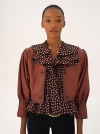 DESCRIPTION Cropped collarless jacket in plonge nappa leather, featuring three-quarter puff sleeves and leather-covered buttons. PRODUCT DETAILS Collarless jacket outer shell: 100% Lambskin Lining: 100% Cupro Inside buttons: 100% Water buffalo horn Fit: cropped - The model is 5'10" (178 cm) and wears a prototype in size 36 - Cropped leather jacket - Leather-covered & horn buttons - Hidden side pockets To make this product, Chloe worked with Leather Working Group (LWG) certified leather manufacturers. LWG certifies tanneries based on their water and energy usage, management of chemicals, solid waste, and wastewater. Color: Burnt Henna Item code: CH26SCV97201642 CARE INSTRUCTIONS To preserve the integrity of your garment, please refrain from washing, entrusting its care to professional cleaning services for optimal maintenance. To maintain its shape, refrain from ironing this garment. To best preserve its texture and form, do not dry clean this garment. To maintain its quality, entrust this garment to a leather specialist only. This garment cannot withstand any bleaching agent. To best preserve its form and texture, please do not tumble dry this garment. To maintain its delicate nature, do not wet clean this garment. TRACEABILITY Better traceability is central to improving our materials as well as social and environmental practices. Finishing: France Tanning: France Dyeing: France