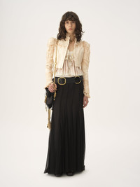 Baroque cropped fitted jacket in silk duchess satin, featuring lace embellishments, puff shoulders and a hook-and-eye closure. PRODUCT DETAILS Cropped fitted jacket outer shell: 100% Silk Main lining: 100% Cotton Front lace: 67% Polyamide, 33% Viscose Back lace: 67% Polyamide, 33% Viscose Collar lace: 60% Cotton, 40% Polyamide Sleeve lace: 60% Cotton, 40% Polyamide Embellishment: 80% Cotton, 20% Polyester Top sleeve: 70% Cotton, 30% Polyamide Sleeve lining: 51% Viscose, 49% Cotton Fit: fitted - The model is 5'10" (178 cm) and wears a prototype in size 36 - Satin jacket - Hook-and-eye front closure Color: Clay Pink Item code: CH25WVE352616H9