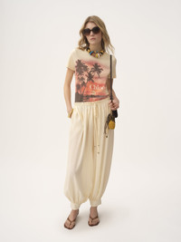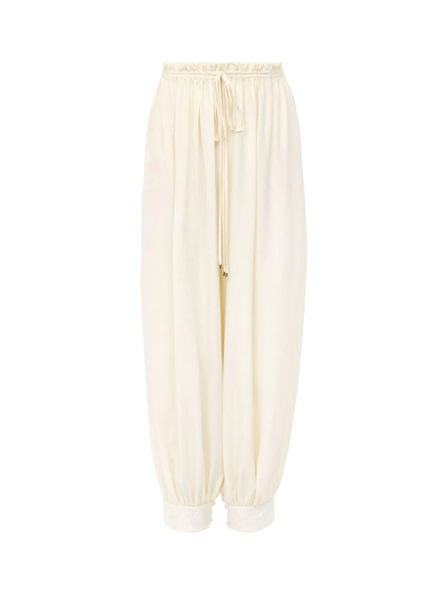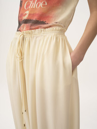 Cropped fluid pants in organic silk crepe de chine with a silk-mix separate shorts lining. The drawstring waist is detailed with gold-tone metal tips, while tonal embroidery and fabric-covered buttons embellish the hem. PRODUCT DETAILS Cropped fluid pants outer shell: 100% Silk Lining: 68% Acetate fiber, 32% Silk Fit: fluid, cropped - The model is 5'10" (178 cm) and wears a prototype in size 36 - Drawstring pants with hammered metal tips - Elasticated waist - Fabric-covered buttons at hem - Separate shorts lining Organic silk manufacturing restricts the use of pesticides, insecticides or harsh chemicals and incorporates methods that respect biodiversity, improve soil quality and reduce water consumption. This product was made in collaboration with Akanjo, a certified WFTO supplier. Akanjo is a social enterprise located in Madagascar that places equal pay and employees' health & wellbeing at the core of their priorities. A long-standing partner of Chloe for 15 years, Akanjo is also committed to training and promoting craftsmanship. Color: Pristine White Item code: CH25APA05077114