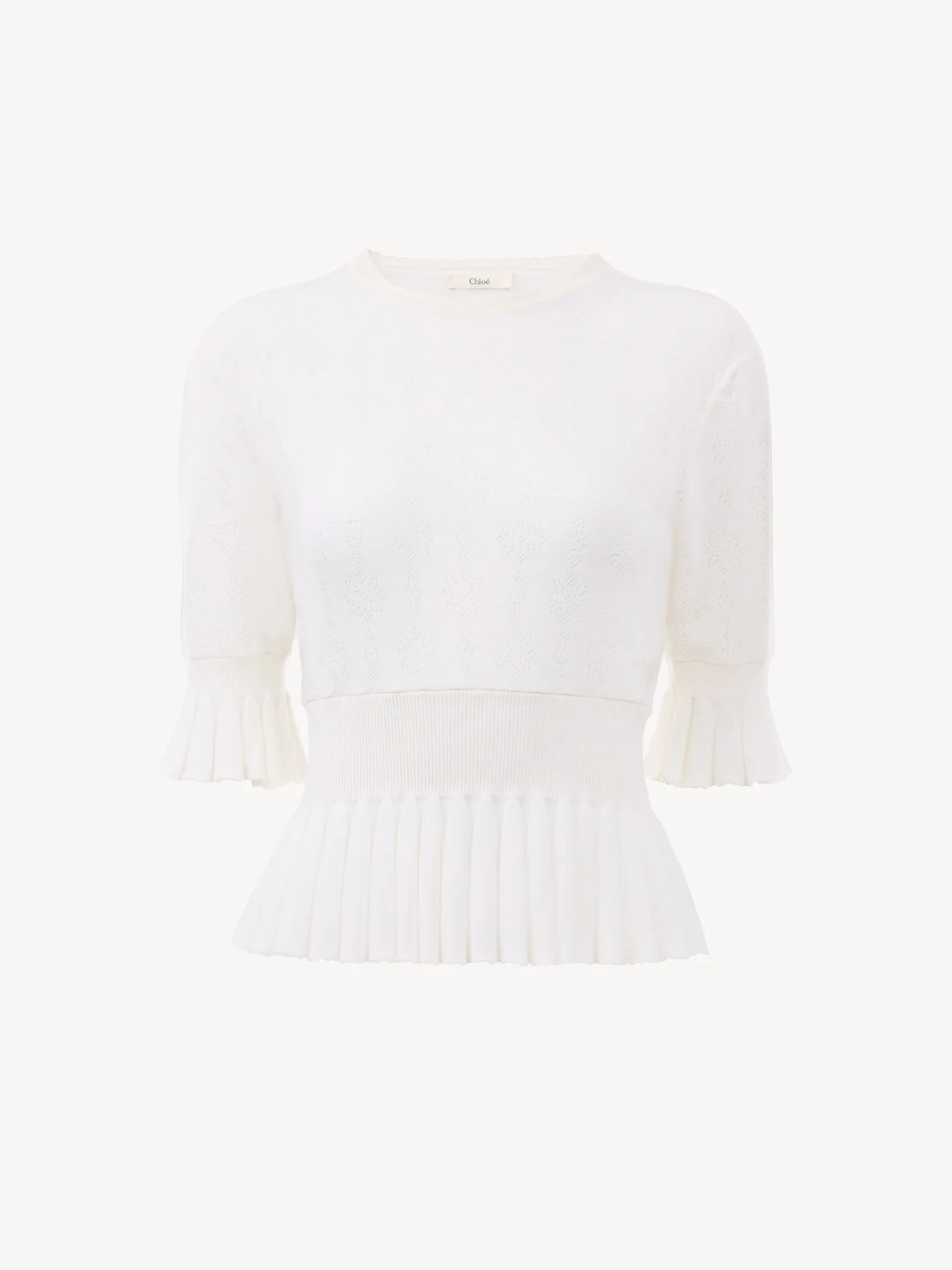 DESCRIPTION Cropped ruffle sweater in a lower-impact wool pointelle knit, featuring elbow-length sleeves and ribbed trims. PRODUCT DETAILS Cropped sweater outer shell: 100% Wool Secondary material: 100% Cotton Ribbing: 90% Wool, 9% Polyamide, 1% Elastane Fit: cropped - The model is 5'10" (178 cm) and wears a prototype in size S - Knit sweater - Slips on The wool used in this product comes from a farm that respects animal welfare, maintains soil health, protects biodiversity and promotes native species. Color: Iconic Milk Item code: CH26UMP71680107 CARE INSTRUCTIONS To preserve the integrity of your garment, please refrain from washing, entrusting its care to professional cleaning services for optimal maintenance. This garment cannot withstand any bleaching agent. To maintain its shape, gently iron this garment at a maximum sole plate temperature of 110°C, taking care to avoid any harsh pressure while ironing. Entrust this garment to a specialist for mild cleaning with tetrachloroethylene and solvent F, ensuring its delicate nature is maintained with the most care. To best preserve its form and texture, please do not tumble dry this garment. To maintain its delicate nature, do not wet clean this garment. TRACEABILITY Better traceability is central to improving our materials as well as social and environmental practices. Dyeing: Italy Knitting: Italy