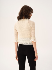 DESCRIPTION Cropped ruffle sweater in an alpaca wool and silk-blend mohair pointelle knit with a layered effect, featuring elbow-length sleeves and fabric-covered buttons. PRODUCT DETAILS Cropped sweater outer shell: 62% Alpaca wool, 38% Silk Fit: cropped - The model is 5'10" (178 cm) and wears a prototype in size S - Knit sweater - Fabric-covered buttons through front Color: Iconic Milk Item code: CH26SMC17555107 CARE INSTRUCTIONS To preserve the integrity of your garment, please refrain from washing, entrusting its care to professional cleaning services for optimal maintenance. This garment cannot withstand any bleaching agent. To maintain its shape, gently iron this garment at a maximum sole plate temperature of 110°C, taking care to avoid any harsh pressure while ironing. Entrust this garment to a specialist for mild cleaning with tetrachloroethylene and solvent F, ensuring its delicate nature is maintained with the most care. To best preserve its form and texture, please do not tumble dry this garment. To maintain its delicate nature, do not wet clean this garment. TRACEABILITY Better traceability is central to improving our materials as well as social and environmental practices. Finishing: Italy Dyeing: Italy Knitting: Italy