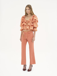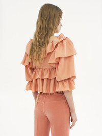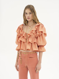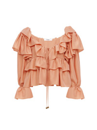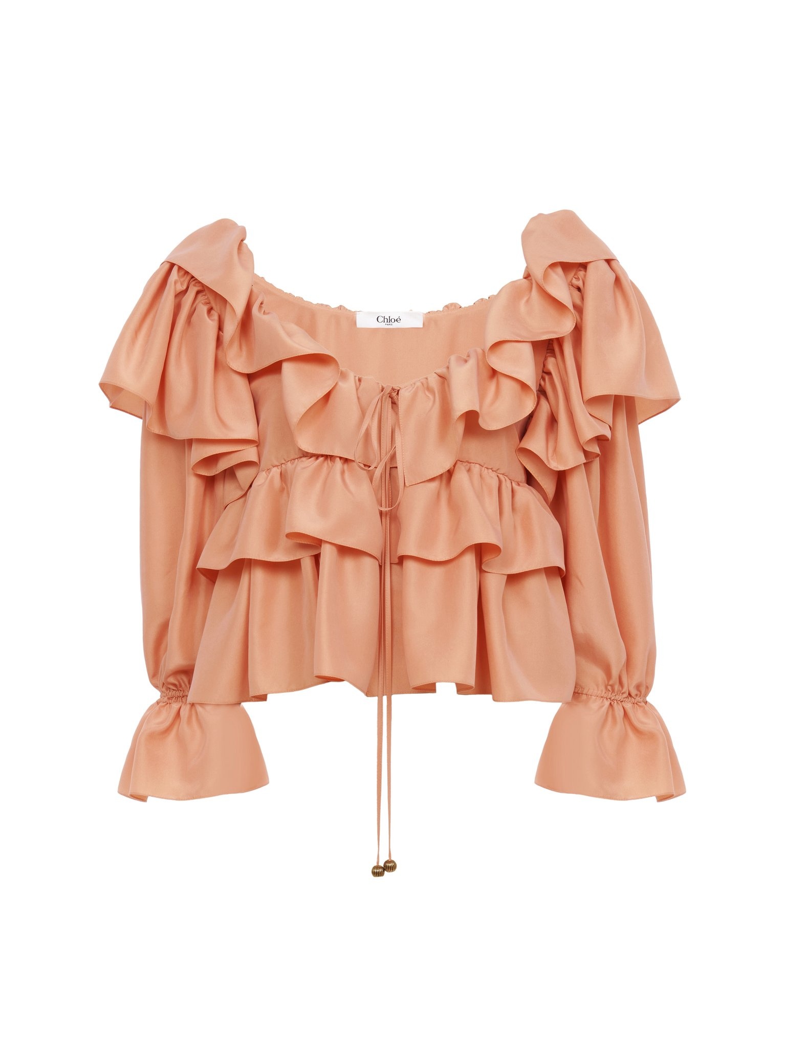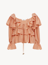Fluid ruffle top in washed silk poplin with a cropped, scoop-neck silhouette, featuring drawstring ties finished with gold-toned tips. PRODUCT DETAILS Ruffle top outer shell: 100% Silk Fit: cropped - The model is 5'10" (178 cm) and wears a prototype in size 36 - Cropped silk top - Fabric-covered buttons - Drawstring ties at neck and cuffs with gold-toned metal tips Care: dry cleaning only Color: Shell Coral Item code: CH25SHT1631482A