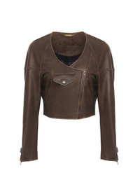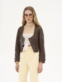 Cropped leather jacket with a vintage finish, featuring a scoop neck, an asymmetrical zipped design, a gathered back and multiple pockets. PRODUCT DETAILS Cropped leather jacket outer shell: 100% Lambskin Main lining: 62% Viscose, 38% Cotton Pocket lining: 51% Cotton, 49% Viscose Fit: cropped - The model is 5'10" (178 cm) and wears a prototype in size 36 - Asymmetrical leather jacket - Front zipper - Zipped pockets & cuffs - Snap buttons - Front flap pocket Care: leather specialist only To make this product, Chloe worked with Leather Working Group (LWG) certified leather manufacturers. LWG certifies tanneries based on their water and energy usage, management of chemicals, solid waste, and wastewater. Color: Bourbon Brown Item code: CH25UCV0220828D