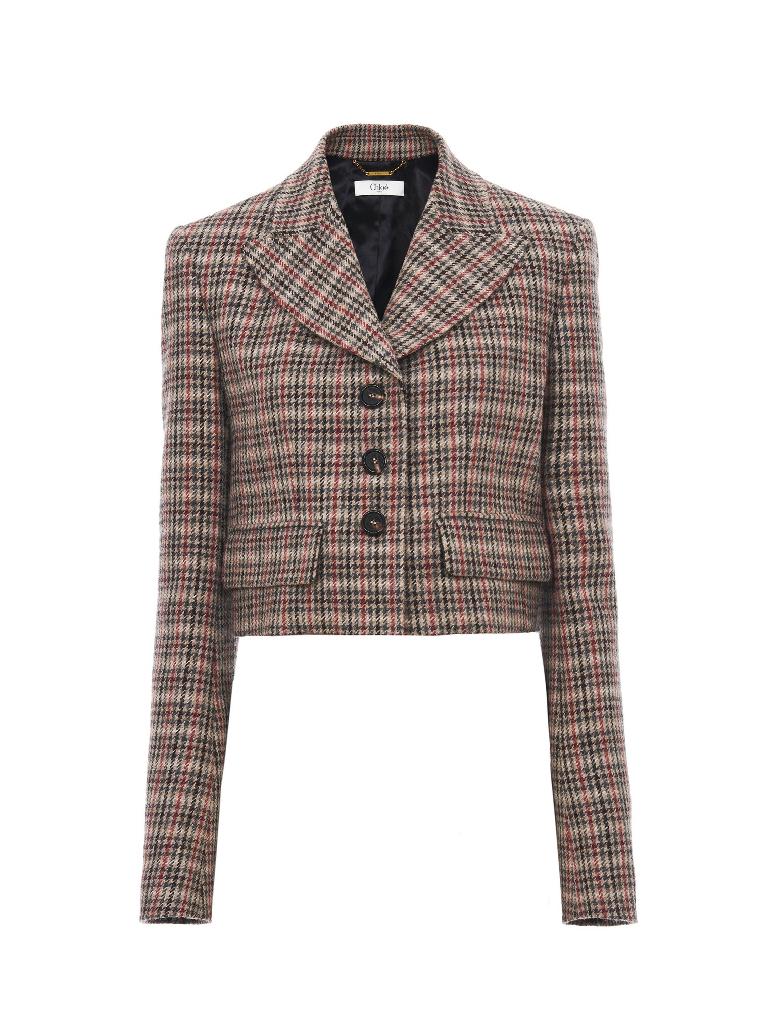 Cropped Spencer jacket in lower-impact houndstooth wool, with engraved horn buttons and flap pockets. PRODUCT DETAILS Cropped Spencer jacket outer shell: 100% Wool Padding: 90% Viscose, 10% Wool Pocket lining: 62% Viscose, 38% Cotton Buttons: 100% Horn Fit: cropped - The model is 5'10" (178 cm) and wears a prototype in size 36 - Cropped houndstooth wool jacket - Engraved horn buttons - Flap pockets Care: dry cleaning only The wool used in this product comes from a farm that respects animal welfare, maintains soil health, protects biodiversity and promotes native species. Color: Beige Multicolor Item code: CH25SVE103372YA