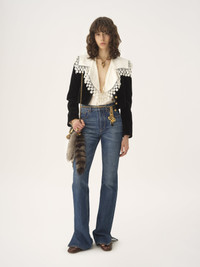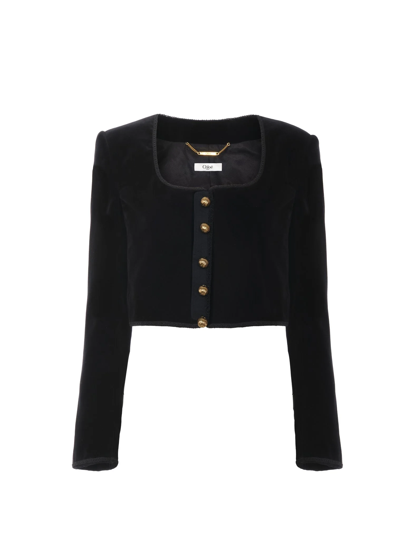 Scoop-neck cropped Spencer jacket in soft cotton velvet with gold-tone pumpkin buttons and a tonal embroidered trim. PRODUCT DETAILS Cropped Spencer jacket outer shell: 100% Cotton Lining: 51% Viscose, 49% Cotton Trim: 84% Viscose, 16% Cotton Fit: cropped, fitted - The model is 5'10" (178 cm) and wears a prototype in size 36 - Velvet jacket - Gold-tone pumpkin buttons through front Color: Black Item code: CH25WVE34091001