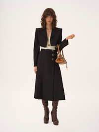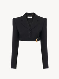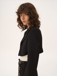 DESCRIPTION Single-breasted cropped Spencer jacket in lower-impact wool grain de poudre, featuring engraved horn buttons and a tonal belt with a gold-tone buckle. PRODUCT DETAILS Cropped Spencer jacket outer shell: 100% Wool Main lining: 100% Silk Buttons: 100% Water buffalo horn Fit: cropped - The model is 5'10" (178 cm) and wears a prototype in size 36 - Tailored jacket - Engraved horn buttons through front & at cuffs The wool used in this product comes from a farm that respects animal welfare, maintains soil health, protects biodiversity and promotes native species. Color: Black Item code: CH26SVE71067001 CARE INSTRUCTIONS To preserve the integrity of your garment, please refrain from washing, entrusting its care to professional cleaning services for optimal maintenance. This garment cannot withstand any bleaching agent. To maintain its shape, gently iron this garment at a maximum sole plate temperature of 110°C, taking care to avoid any harsh pressure while ironing. Entrust this garment to a specialist for mild cleaning with tetrachloroethylene and solvent F, ensuring its delicate nature is maintained with the most care. To best preserve its form and texture, please do not tumble dry this garment. To maintain its delicate nature, do not wet clean this garment. TRACEABILITY Better traceability is central to improving our materials as well as social and environmental practices. Dyeing: Italy Finishing: Italy Weaving: Italy