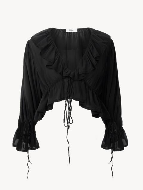 DESCRIPTION Cropped V-neck ruffle top in iconic organic silk georgette with lace trims, featuring puff sleeves and drawstring ties. PRODUCT DETAILS V-neck ruffle top outer shell: 100% Silk Lacework: 95% Cotton, 5% Polyamide Buttons: 100% Mother-of-pearl Fit: cropped - The model is 5'10" (178 cm) and wears a prototype in size 36 - Cropped silk top - Mother-of-pearl button at chest - Drawstring chest & cuffs Organic silk manufacturing restricts the use of pesticides, insecticides or harsh chemicals and incorporates methods that respect biodiversity, improve soil quality and reduce water consumption. Color: Black Item code: CH26UH124002001 CARE INSTRUCTIONS To preserve the integrity of your garment, please refrain from washing, entrusting its care to professional cleaning services for optimal maintenance. This garment cannot withstand any bleaching agent. To maintain its shape, gently iron this garment at a maximum sole plate temperature of 110°C, taking care to avoid any harsh pressure while ironing. Entrust this garment to a specialist for mild cleaning with tetrachloroethylene and solvent F, ensuring its delicate nature is maintained with the most care. To best preserve its form and texture, please do not tumble dry this garment. To maintain its delicate nature, do not wet clean this garment. TRACEABILITY Better traceability is central to improving our materials as well as social and environmental practices. Dyeing: Italy Finishing: Italy Weaving: Italy