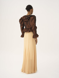 Cropped V-neck ruffle top in washed radiant silk taffeta, featuring puff sleeves and a front tie fastening. PRODUCT DETAILS V-neck ruffle top outer shell: 100% Silk Buttons: 100% Mother-of-pearl Fit: cropped - The model is 5'10" (178 cm) and wears a prototype in size 36 - Cropped silk top - Mother-of-pearl button at chest - Front tie fastening This product was made by Marie Helene Couture, a long-standing partner of Chloe based in Morlaas, France. Marie Helene Couture excels in the specialized technique of couture "flou". Their expertise aligns with the rigorous standards set by the "metiers de la mode, vetement flou" certification, ensuring a high level of professional aptitude in this delicate and skilled art form. Color: Plain Brown Item code: CH25WHT3510326N