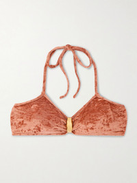 Chloe's bikini top is made from velvet that's equally soft and stretchy. It has a minimal design with a hammered gold-tone embellishment at the front and adjustable straps. Size & Fit - Fits true to size, take your normal size - Model is 180cm/ 5'11", bra size 32A and is wearing a size FR 36 Model measurements: - Bust: 79cm/ 31" - Waist: 62cm/ 24.5" - Hip: 91cm/ 36" Details & Care - Terracotta velvet - Ties at neck and back - 85% polyamide, 15% elastane - Lotion, sunscreen, oil and chlorine can cause discoloration of this item; this is not a manufacturing defect. Please follow care instructions to keep your swimwear in the best condition