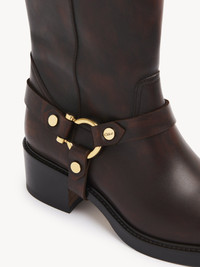 Crafted from brushed calfskin, the Dakota boots are inspired by classic biker boots. The sturdy structure combines a tall tube leg with a low stacked heel for day-long comfort. A Chloe-engraved gold-toned harness finishes these versatile leather boots. PRODUCT DETAILS Boot heel height: 1.6" (4 cm) Heel-to-toe drop: 0.8" (2 cm) Upper: coated calfskin Inner sole: calfskin Main lining: calfskin Secondary lining: suede goatskin Sole: 80% calfskin, 20% thermoplastic polyurethane Fit true to size, European sizing - Slip-on To make this product, Chloe worked with Leather Working Group (LWG) certified leather manufacturers. LWG certifies tanneries based on their water and energy usage, management of chemicals, solid waste, and wastewater. Color: Oak Brown Item code: CHC25S07QPW23O