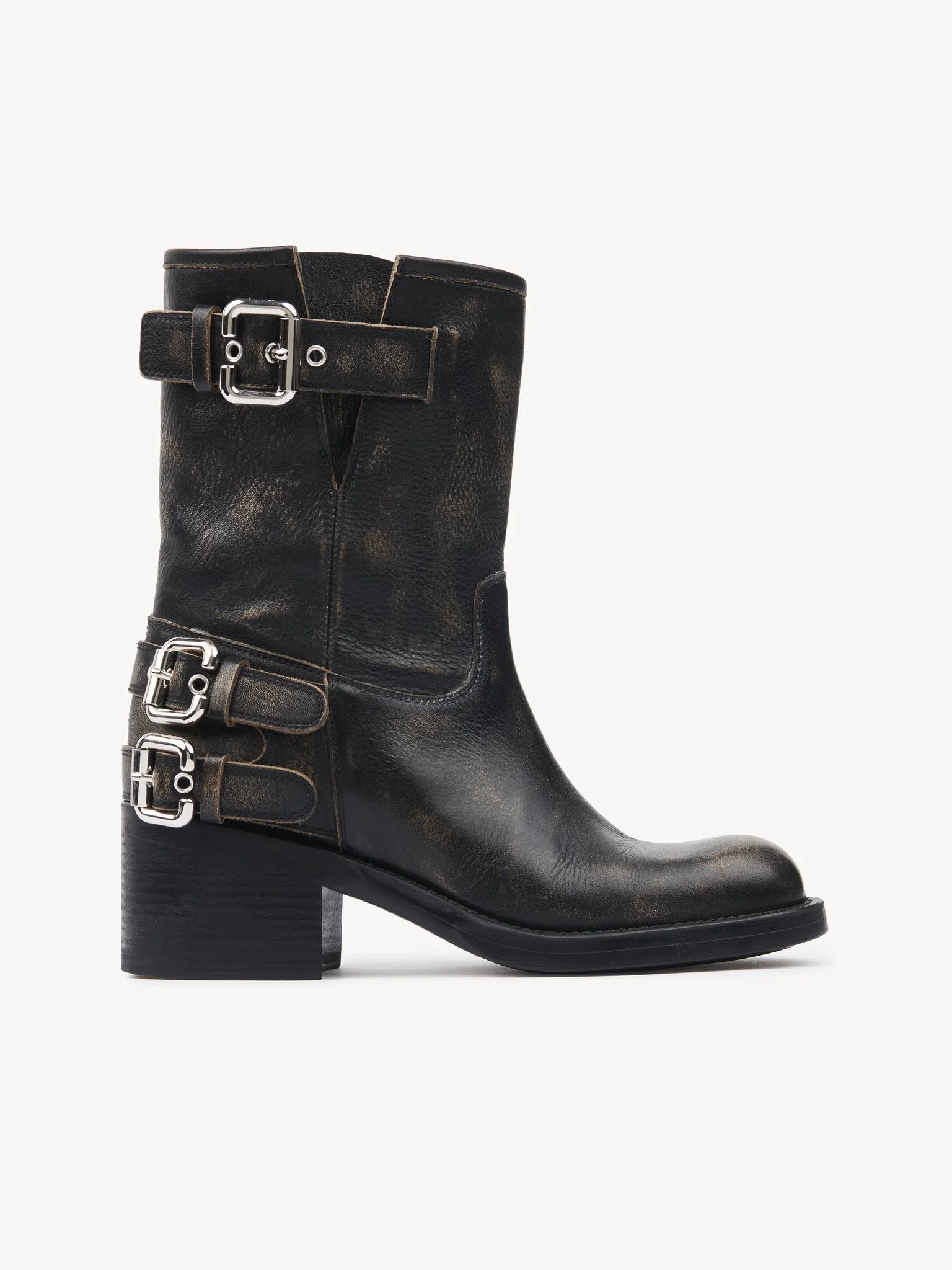Crafted from grained brushed calfskin, these Dakota boots are inspired by classic biker boots. Set on a sturdy rubber structure, they combine a high tube leg with a comfortable stacked heel. Multiple silver-tone Paddington buckles finish these knee-high boots. PRODUCT DETAILS Biker boot heel height: 2.4" (6 cm) Heel-to-toe drop: 1.6" (4 cm) Upper: calfskin Inner sole: calfskin Main lining: calfskin Sole: rubber Fit true to size, European sizing - Slip-on To make this product, Chloe worked with Leather Working Group (LWG) certified leather manufacturers. LWG certifies tanneries based on their water and energy usage, management of chemicals, solid waste, and wastewater. Color: Black Item code: CHC25A12ESY001