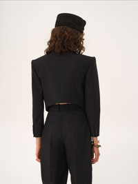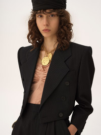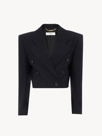 DESCRIPTION Double-breasted cropped Spencer jacket in lower-impact striped wool, featuring engraved horn buttons and a chest pocket. PRODUCT DETAILS Cropped Spencer jacket outer shell: 100% Wool Lining: 100% Silk Buttons: 100% Water buffalo horn Fit: cropped - The model is 5'10" (178 cm) and wears a prototype in size 36 - Tailored jacket - Engraved horn buttons through front & at cuffs - Decorative chest pocket The wool used in this product comes from a farm that respects animal welfare, maintains soil health, protects biodiversity and promotes native species. Color: Black Item code: CH26SVE76065001 CARE INSTRUCTIONS To preserve the integrity of your garment, please refrain from washing, entrusting its care to professional cleaning services for optimal maintenance. This garment cannot withstand any bleaching agent. To maintain its shape, gently iron this garment at a maximum sole plate temperature of 110°C, taking care to avoid any harsh pressure while ironing. Entrust this garment to a specialist for mild cleaning with tetrachloroethylene and solvent F, ensuring its delicate nature is maintained with the most care. To best preserve its form and texture, please do not tumble dry this garment. To maintain its delicate nature, do not wet clean this garment. TRACEABILITY Better traceability is central to improving our materials as well as social and environmental practices. Dyeing: Poland Finishing: Italy Weaving: Italy