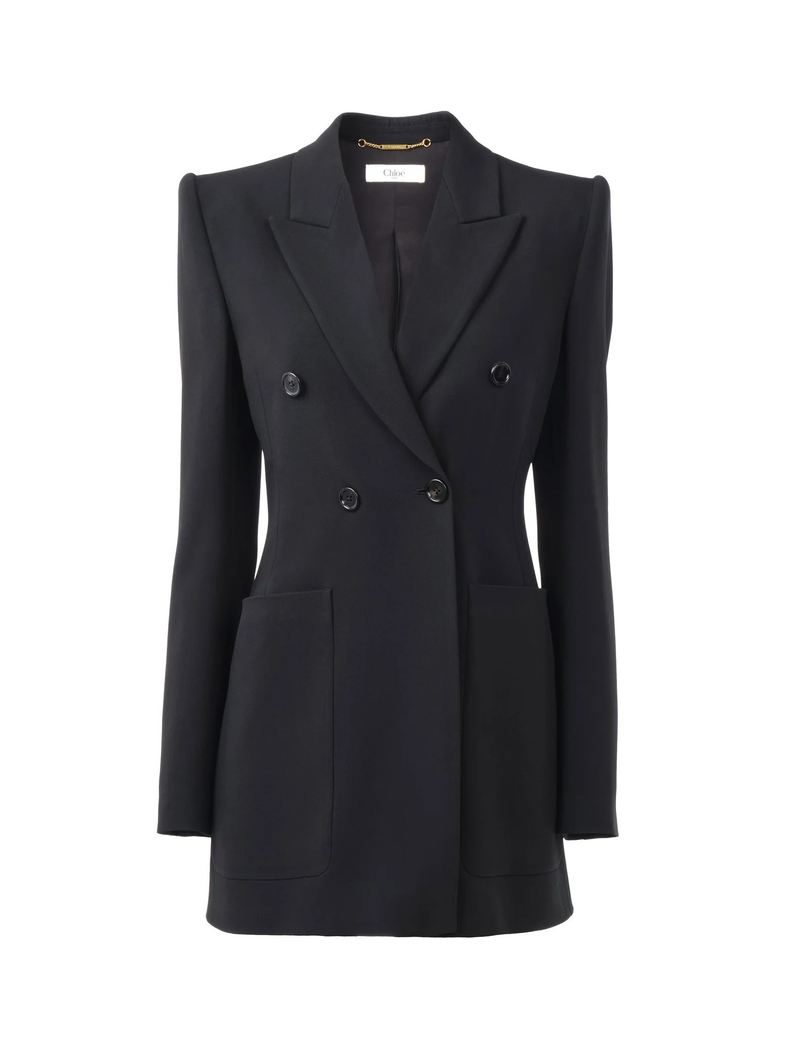 Double-breasted tailored jacket in a soft crepe mix, featuring oversized front patch pockets and engraved horn buttons. PRODUCT DETAILS Double-breasted tailored jacket outer shell: 50% Acetate fiber, 47% Viscose, 3% Elastane Lining: 100% Silk Buttons: 100% Water buffalo horn Fit: tailored - The model is 5'10" (178 cm) and wears a prototype in size 36 - Tailored double-breasted jacket - Engraved horn buttons at front & cuffs - Oversized front patch pockets Color: Black Item code: CH25AVE30263001