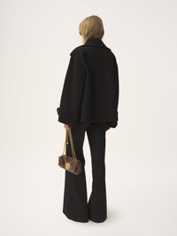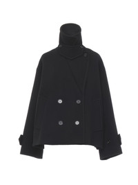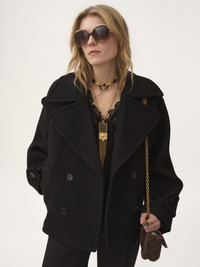 Double-breasted oversized short coat in iconic soft wool with a chin-strap collar and horn buttons. PRODUCT DETAILS Oversized short coat outer shell: 80% Wool, 20% Polyamide Lining: 62% Viscose, 38% Cotton Buttons: 100% Water buffalo horn Fit: oversized, short - The model is 5'10" (178 cm) and wears a prototype in size 36 - Oversized wool coat - Engraved horn buttons at front, chin strap & cuffs - Side pockets Color: Black Item code: CH25AMA96952001