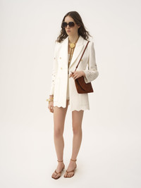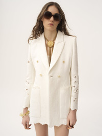 Double-breasted tailored jacket in a quilted floral jacquard cotton mix with floral broderie anglaise and scalloped trims, featuring oversized front patch pockets. PRODUCT DETAILS Double-breasted tailored jacket outer shell: 55% Cotton, 28% Polyamide, 17% Linen Lining: 100% Cotton Embroidery thread: 70% Viscose, 30% Polyester Buttons: 100% Water buffalo horn Fit: tailored - The model is 5'10" (178 cm) and wears a prototype in size 36 - Tailored double-breasted jacket - Engraved horn buttons at front - Oversized front patch pockets Color: Iconic Milk Item code: CH25AVE31134107