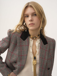 Double-breasted tailored jacket in lower-impact wool check, featuring a contrast velvet collar, front flap pockets and engraved horn buttons. PRODUCT DETAILS Double-breasted tailored jacket outer shell: 100% Wool Lining: 100% Silk Collar: 100% Cotton Button: 100% Water buffalo horn Fit: tailored - The model is 5'10" (178 cm) and wears a prototype in size 38 - Tailored double-breasted jacket - Engraved horn buttons at front & cuffs - Front flap pockets The wool used in this product comes from a farm that respects animal welfare, maintains soil health, protects biodiversity and promotes native species. Color: Black Item code: CH25AVE64097905