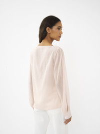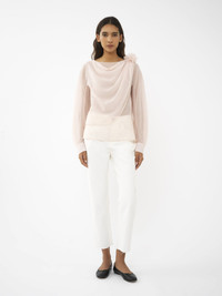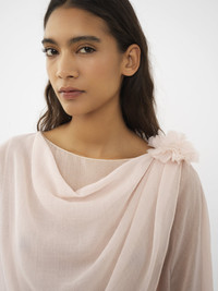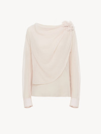 Made from a fine and delicate lower-impact wool gauze, this boat-neck top has a draped front for a romantic aesthetic. A 3D flower brooch with hand-made petals adorns the left shoulder, accentuating the feminine mood while showcasing the Maison's technical craftsmanship. PRODUCT DETAILS Boat-neck top main material: 100% Wool Care: dry cleaning only Fit: straight - The model is 5'10" (178 cm) and wears a prototype in size 36 - Floral top - Slips on The wool used in this product comes from a farm that respects animal welfare, maintains soil health, protects biodiversity and promotes native species. Color: Pansy Pink Item code: CHC24SHT260616H5