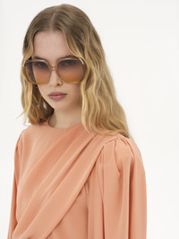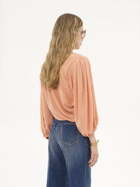 Draped cropped top in organic silk crepe de chine, featuring puff sleeves and a fabric-covered button at the back. PRODUCT DETAILS Draped cropped top outer shell: 100% Silk Lining: 100% Silk Fit: fluid - The model is 5'10" (178 cm) and wears a prototype in size 36 - Draped silk top - Single fabric-covered button at back - Fabric-covered buttons at cuffs Care: dry cleaning only Organic silk manufacturing restricts the use of pesticides, insecticides or harsh chemicals and incorporates methods that respect biodiversity, improve soil quality and reduce water consumption. This product was made in collaboration with Akanjo, a certified WFTO supplier. Akanjo is a social enterprise located in Madagascar that places equal pay and employees' health & wellbeing at the core of their priorities. A long-standing partner of Chloe for 15 years, Akanjo is also committed to training and promoting craftsmanship. Color: Blushy Pink Item code: CH25UHT69125266