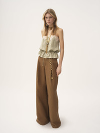Thin-strap camisole top in organic silk with a roses jacquard, featuring lace trims and a drawstring waist finished with gold-tone metal tips. PRODUCT DETAILS Camisole top outer shell: 100% Silk Main lacework: 88% Polyester, 12% Polyamide Straps: 100% Polyamide Fit: fluid - The model is 5'10" (178 cm) and wears a prototype in size 36 - Sleeveless silk top - Drawstring waist with hammered metal tips Organic silk manufacturing restricts the use of pesticides, insecticides or harsh chemicals and incorporates methods that respect biodiversity, improve soil quality and reduce water consumption. Color: Clear Green Item code: CH25AHT22115337
