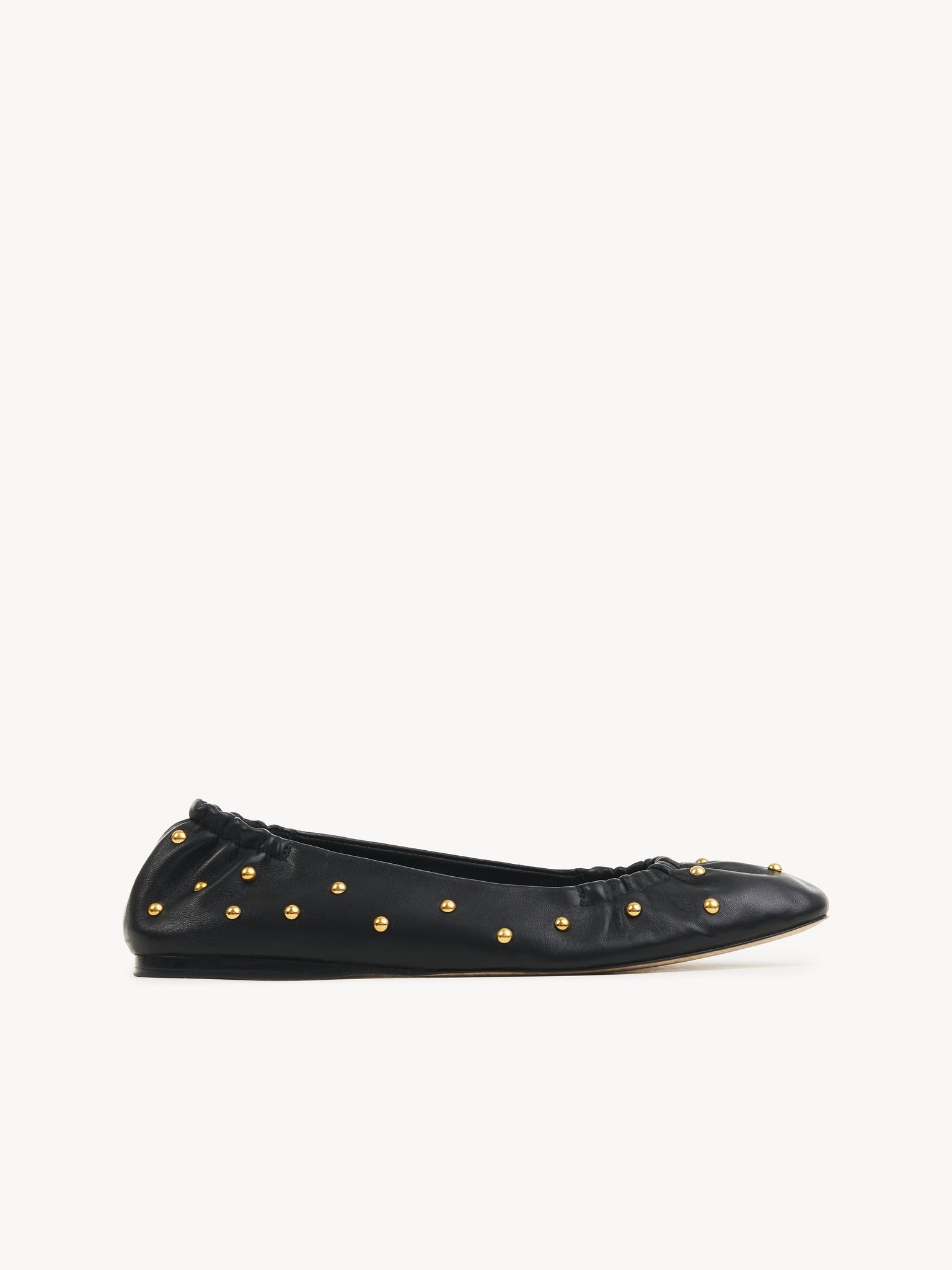 Crafted from semi-shiny lambskin, the Eia ballerina has a soft and supple silhouette, pairing a pleated upper with gold-tone studs. PRODUCT DETAILS Flat ballerina Upper: lambskin Inner sole: sheepskin Main lining: sheepskin Sole: nubuck cowhide Fit true to size, European sizing - Slip-on To make this product, Chloé worked with Leather Working Group (LWG) certified leather manufacturers. LWG certifies tanneries based on their water and energy usage, management of chemicals, solid waste, and wastewater. Color: Black Item code: CHC24A03QMH001