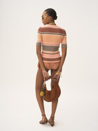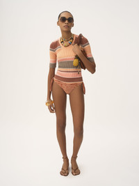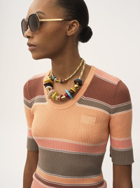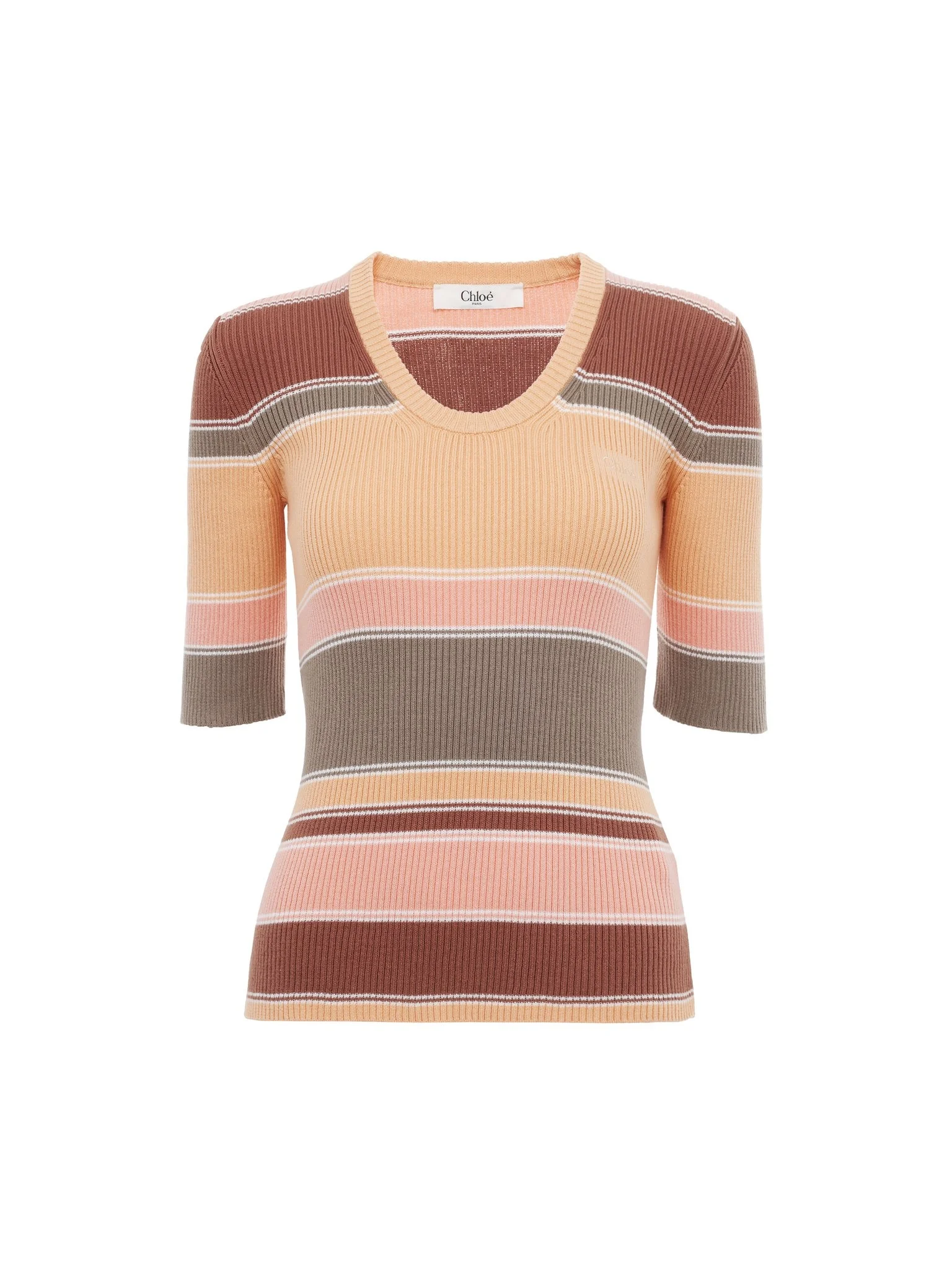 Scoop-neck, elbow-sleeve fitted top in a striped rib knit, signed by subtle Chloe logo embroidery at the chest. PRODUCT DETAILS Fitted top outer shell: 100% Cotton Fit: fitted - The model is 5'10" (178 cm) and wears a prototype in size S - Striped knit top - Slips on Color: Orange Multicolor Item code: CH25AMP386608ZA