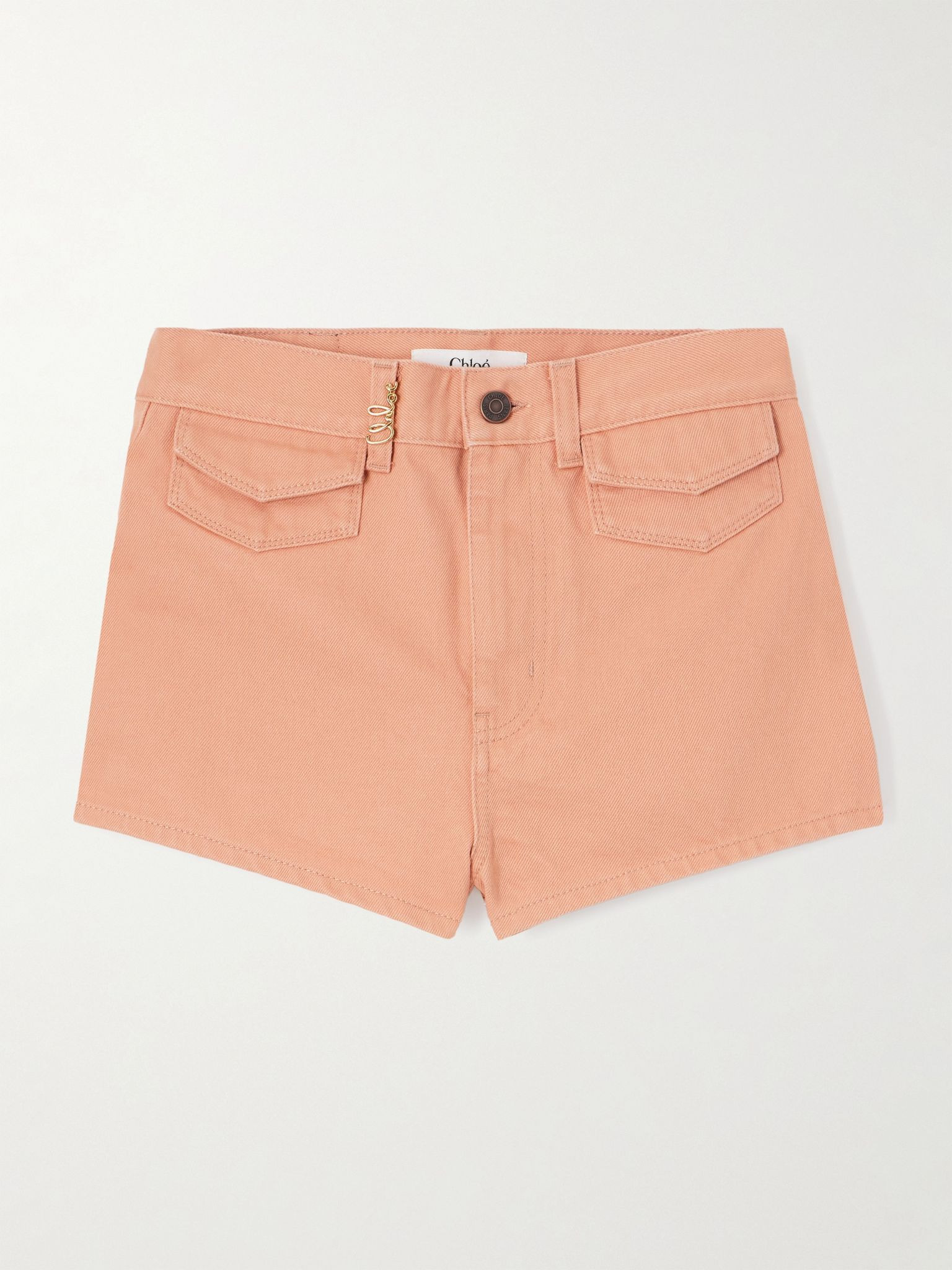 Chloe's shorts are perfect for summer, whether you're in the city or on vacation. Tailored from denim, they have a mid-rise with double flap pockets on either side. The soft peach shade works well with neutrals and the logo-embellished belt loop will match gold-tone jewelry beautifully. Size & Fit - Fits true to size, take your normal size - High-rise, cut for a slim fit - Mid-weight, non-stretchy fabric - Model is 177cm/ 5'10" and is wearing a FR 36 Model measurements: - Bust: 75cm/ 29.5" - Waist: 60.5cm/ 24" - Hip: 88.5cm/ 35" Details & Care - Peach denim - Button and concealed zip fastening at front - 100% cotton - Dry clean