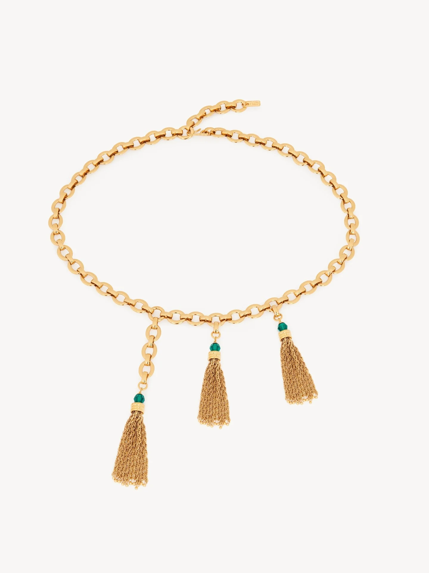 DESCRIPTION Chloe Pompoms jewelry belt in vintage gold brass. The adjustable chain features meticulously hand-assembled chain tassels and crystal glass emerald pearls. Adjust the chain to wear the belt high on the waist or low on the hips, depending on your silhouette. PRODUCT DETAILS Jewelry belt in brass & crystal glass - One size only - Adjustable - Chloe logo engraving - Wear on waist or hips To ensure this item's quality and longevity, wear it regularly and avoid exposure to direct sunlight and heat. Avoid impact, and contact with water, perfume or chlorine. Store your jewel in its pouch and box when not in use. Color: Vintage Gold Item code: CHC25SC089CH59DC CARE INSTRUCTIONS To ensure this item's quality and longevity, wear it regularly and avoid exposure to direct sunlight and heat. Avoid impact, and contact with water, perfume or chlorine. Store your jewel in its pouch and box when not in use.
