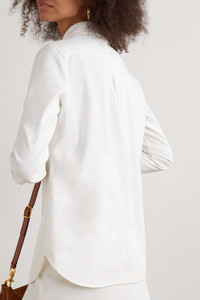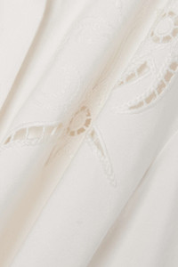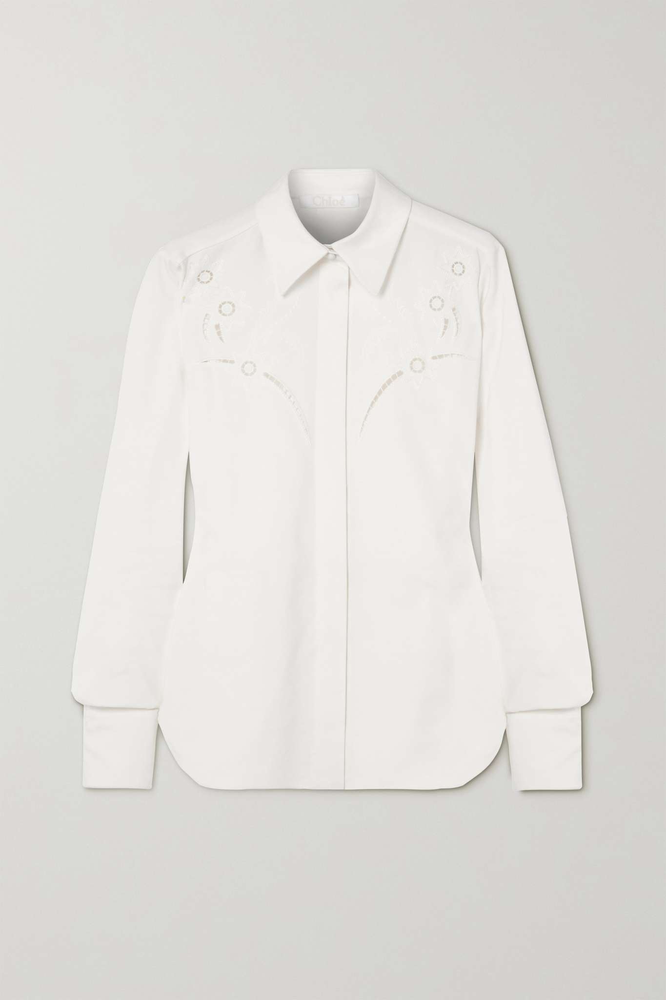 EDITORS'NOTES Chloé's shirt is detailed with delicate embroidery and pointelle stitching at the front. Made from grain de poudre, it's tailored for a slim fit and has a pointed collar and curved hem. Style yours with blue denim and loafers. SIZE & FIT - Fits true to size, take your normal size - Designed for a slim fit - Mid-weight, non-stretchy fabric - Model is 177cm/ 5'10" and is wearing a FR 36 DETAILS & CARE - White grain de poudre - Partially concealed button fastenings through front - 56% viscose, 44% ramie - Designer color: Iconic Milk