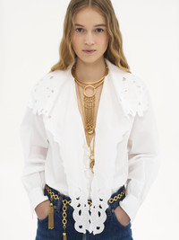 Lavalliere shirt in organic cotton poplin, featuring cut-work embroidery on the lavalliere scarf and shoulders, along with mother-of-pearl buttons through the V-neck front. PRODUCT DETAILS Lavalliere shirt outer shell: 100% Cotton Buttons: 100% Mother-of-pearl Fit: straight - The model is 5'10" (178 cm) and wears a prototype in size 36 - Embroidered cotton shirt - Mother-of-pearl buttons through front & at cuffs Care: dry cleaning only An organic cotton farming system sustains the health of soils, ecosystems and people by eliminating the use of toxic and persistent organic pollutants and increasing water conservation. Color: White Item code: CH25SHT17310101