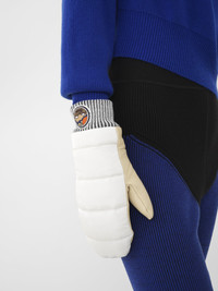 Part of the Chloé Mountain capsule designed for mountain leisure and après-ski activities, these sporty mittens combine quilted eco-nylon with a soft deerskin palm and a ribbed wool cuff. A graphic logo patch showing a mountain landscape signs this piece. Wear these mittens with the matching scarf and beanie for the full look. PRODUCT DETAILS Mountain mittens in eco-nylon, soft deerskin & wool Internal lining: Wool External lining: 45% Eco-nylon, 45% Soft deerskin, 10% Wool Patch: Polyester - One size only Care: leather specialist only Color: White & Beige Item code: CHC24SG017SKG90Z