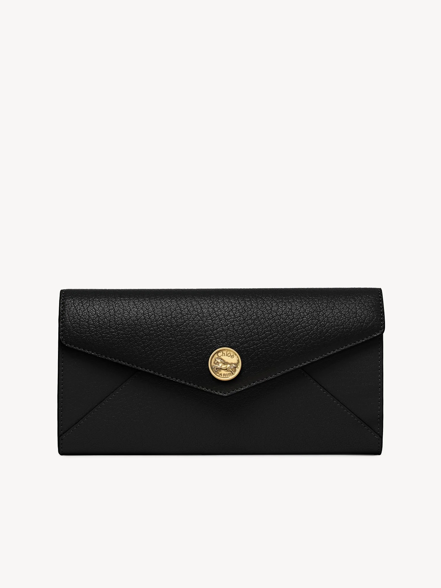 Crafted from grained goatskin, this Envelope long wallet with flap features two main compartments, 12 card slots and a zipped outer pocket. The slim, elongated design is finished with the Maison's golden Horse Medal in a nod to the equestrian world. PRODUCT DETAILS Envelope long wallet with flap in grained goatskin Main lining: Calfskin Inner lining: 65% Polyester, 35% Cotton - 1 flap with snap button closure - 2 main compartments - 12 card slots - 1 flat pocket - 1 zipped outer pocket Comes with a dust bag - Width: 7.9" (20 cm) - Height: 4.7" (12 cm) This long wallet is made from natural leather with a very light and transparent finish. Keep away from water (rain). The wallet may develop smooth or light halos. If the leather gets wet, dry it with a soft white cloth to absorb water. With use, the leather may become marked and shiny. To make this product, Chloe worked with Leather Working Group (LWG) certified leather manufacturers. LWG certifies tanneries based on their water and energy usage, management of chemicals, solid waste, and wastewater. Color: Black Item code: CH25SP540O93001